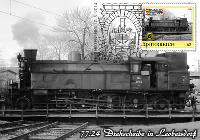 Marken- und Kartenmotiv: Dampflok 77.24 auf der Drehscheibe in Leobersdorf, (fotografiert am 02.01.1966 von Karl Wildberger) Rückseite: Logo Hibria 2014
