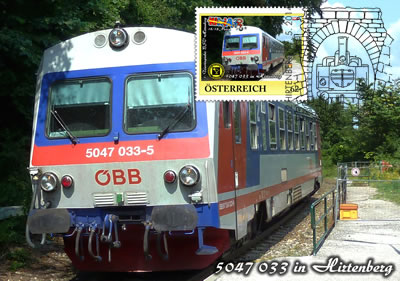Marken- und Belegmotiv: Triebwagen 5047 033 in der Haltestelle Hirtenberg, (fotografiert am 14.07.2013 von Karl Wildberger) Rückseite: Logo Hibria 2014