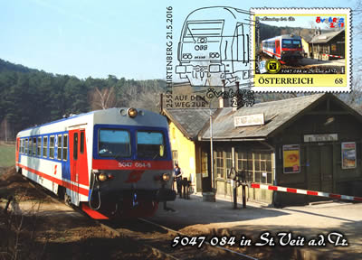 Marken- und Kartenmotiv: Triebwagen 5047 084 in St. Veit a.d.Tr. (fotografiert von Karl Wildberger) Rückseite: Logo ÖVEBRIA 2017